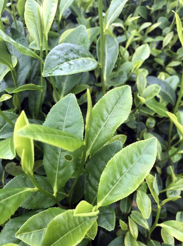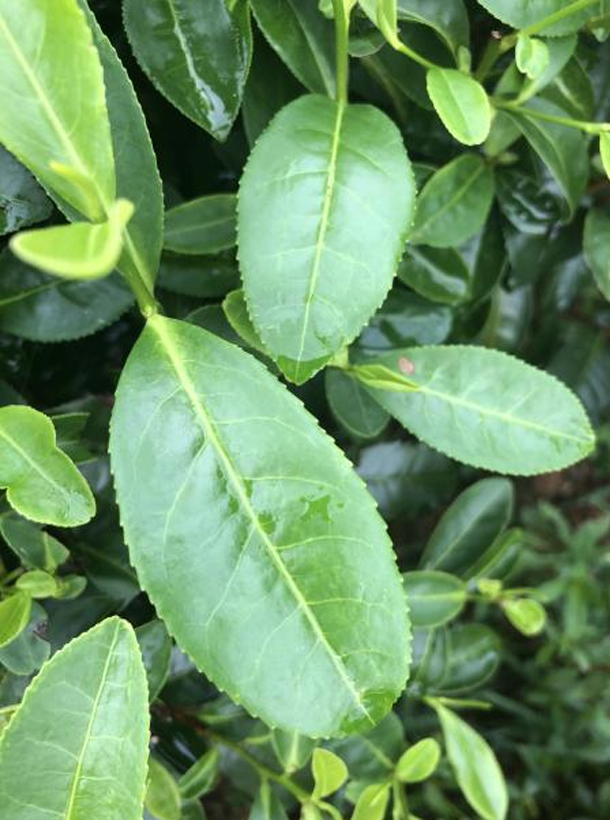 【性状特征】树姿半开张,分枝较密。叶片呈半上斜状着生,椭 服形,叶色绿,有光泽,叶面平展,叶身平,,叶缘平,叶尖渐尖,叶脉11对,锯齿37对,叶质较厚软。花瓣白色、5瓣,尊片5枚,柱头3裂。产量高,4~6龄茶园仅春季每667m'可产鲜叶1030kg。春季萌发早。2010年和2011年在长沙县高桥镇观测,一芽二叶初展期分别为4月3日和3月27日,分别比福鼎大白茶早1天和6天。芽叶生育力和持嫩性强,浅绿色,茸毛较多,一芽二叶百芽重20.3g。